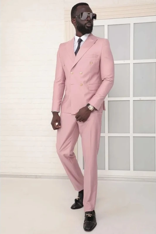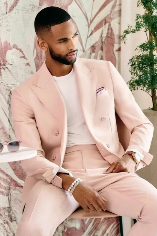Same Color Scheme Sophistication: When wearing as a guest or as a groomsmen/groom, the pink suit can balance the visual focus, reflecting taste without overshadowing the couple. Choose a dried rose pink suit set, pairing with a low-saturation beige silk shirt; a tweed coat with silk pink pants, using material differences to enrich the layers.