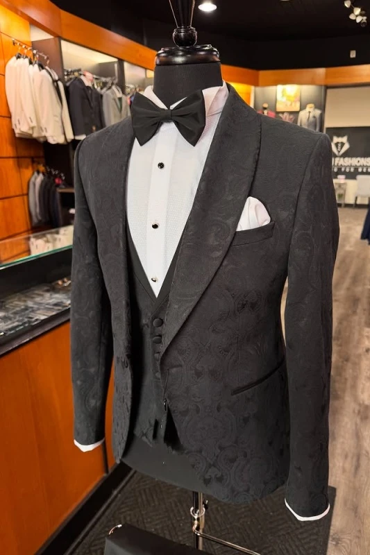 Aidan Chic Black Shawl Lapel Three Pieces Jacquard Wedding Men Suits
