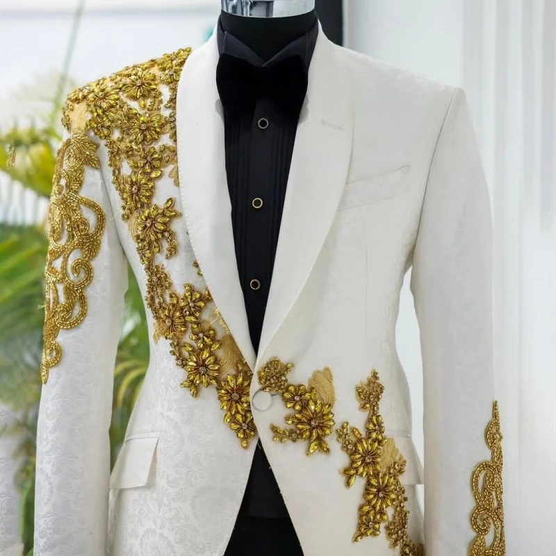 Aiden Newest White Jacquard Shawl Lapel Appliques Wedding Men Suits