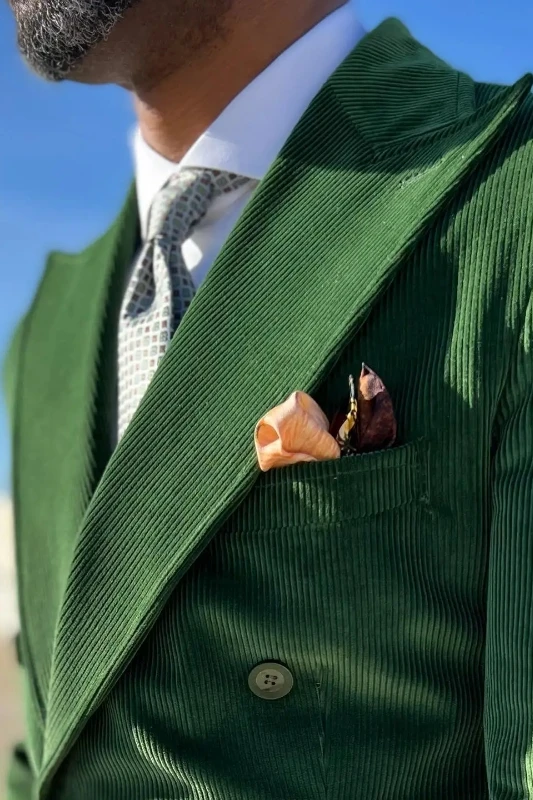 Allen Trendy Dark Green Corduroy Peaked Lapel Double Breasted Men Suits