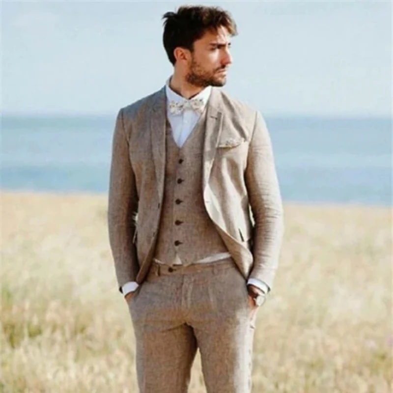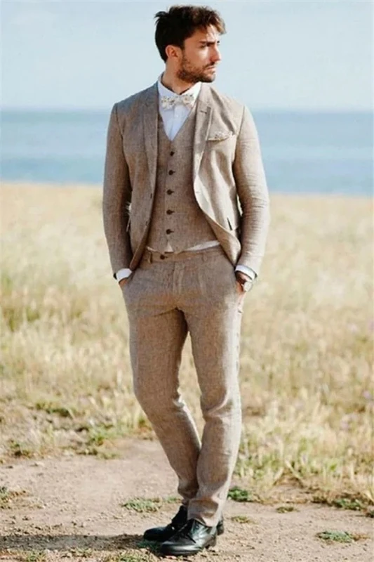 Archer Light Brown Linen Notched Lapel Three Pieces Men Suits