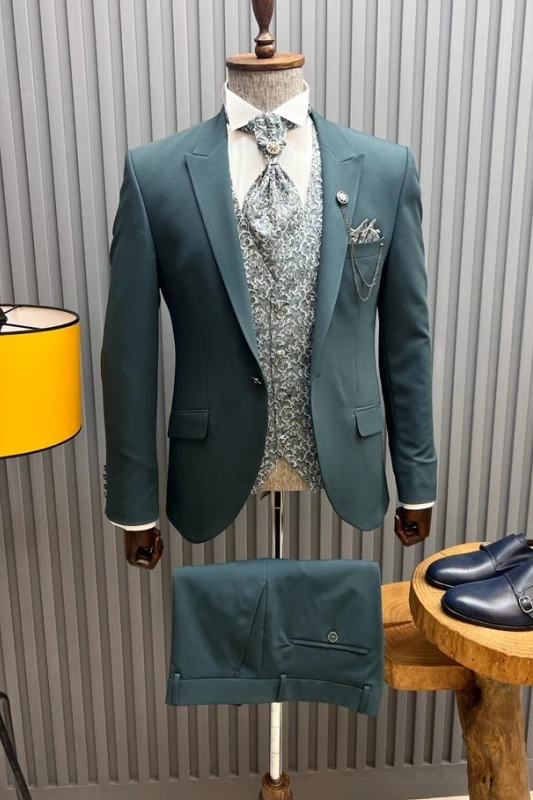 Bartley Ocean Blue Peaked Lapel Three Pieces Prom Suits With Jacquard Vest