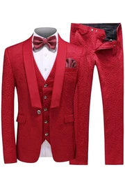 Ben Chic Red Shawl Lapel Three Pieces Jacquard Men Suits For Wedding