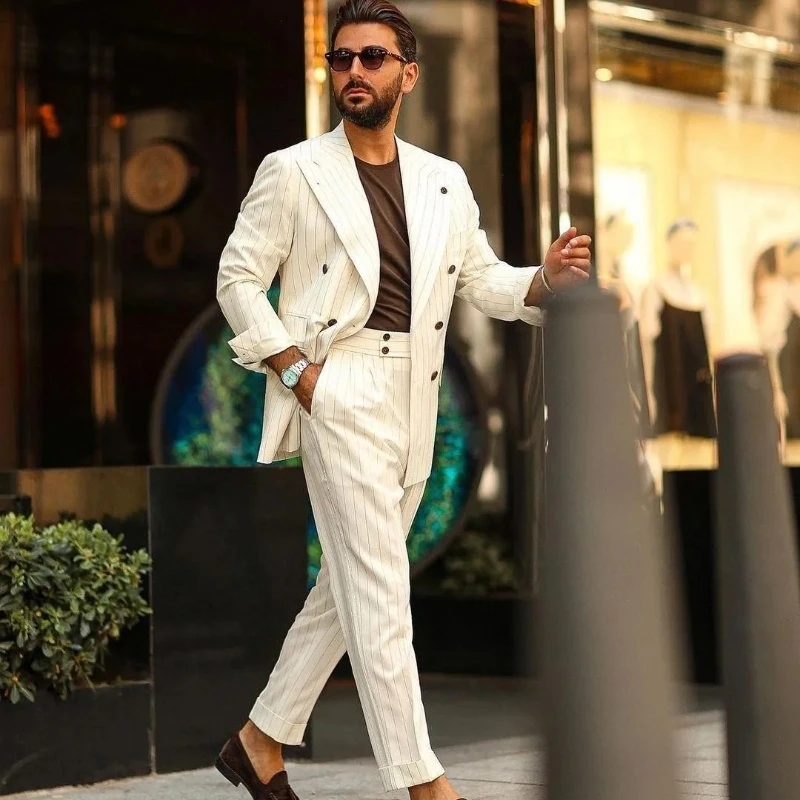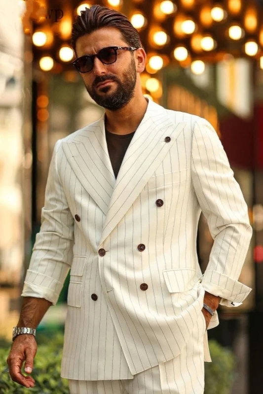 Ben Fashion White Peaked Lapel Double Breasted Striped Men Suits