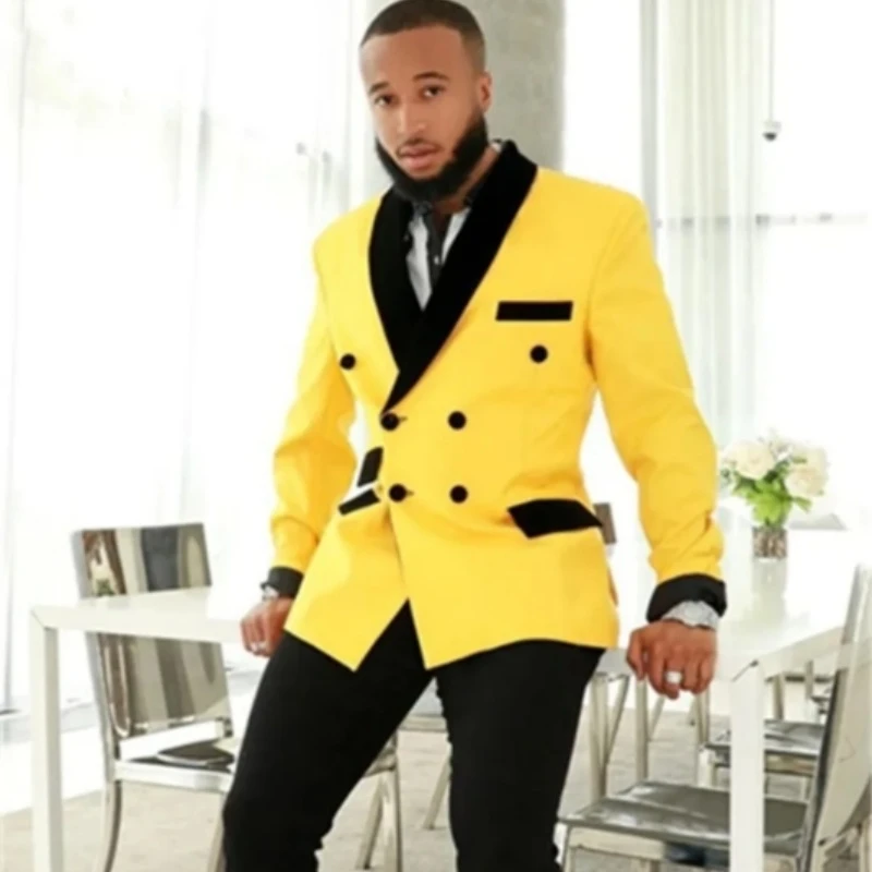 Berger Fashion Yellow Double Breasted Men Suits With Black Shawl Lapel