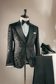 Bert Formal Black Peaked Laple Three Pieces Jacquard Prom Suits