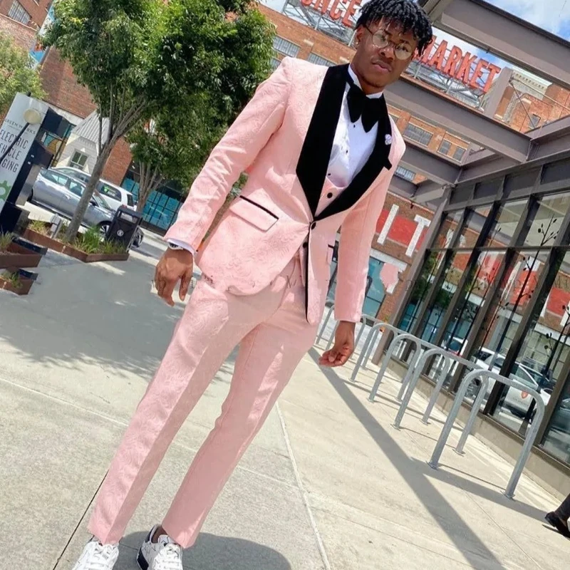 Bertram Trendy Pink Shawl Lapel Jacquard Three Pieces Men Suits For Wedding