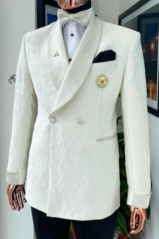 Bob Bespoke White Shawl Lapel Double Breasted Jacquard Wedding Suits