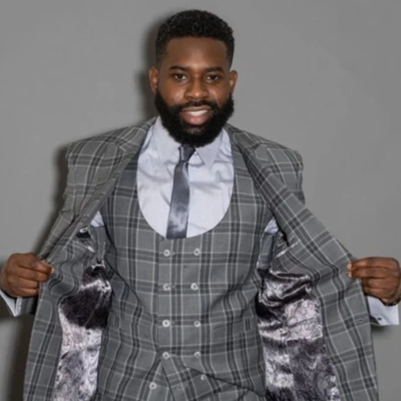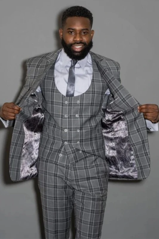 Brooklyn Gray Peaked Lapel Plaid Three Pieces Men Suits For Business