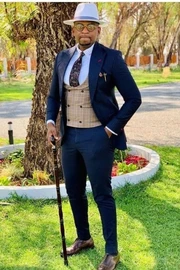 Bruno Dark Blue Peaked Lapel Striped Three Pieces Prom Suits For Men