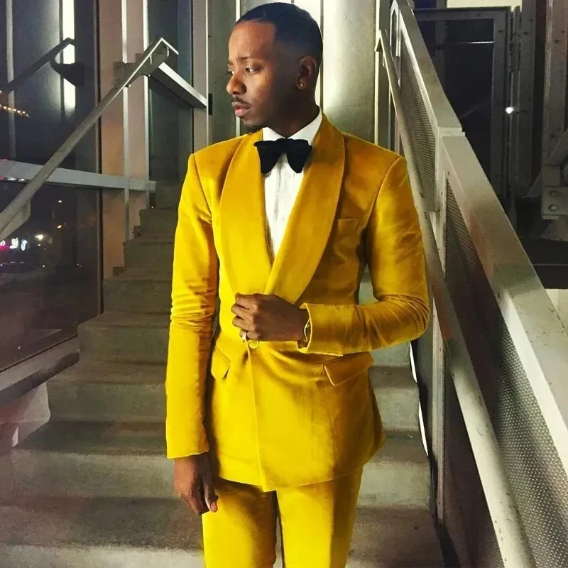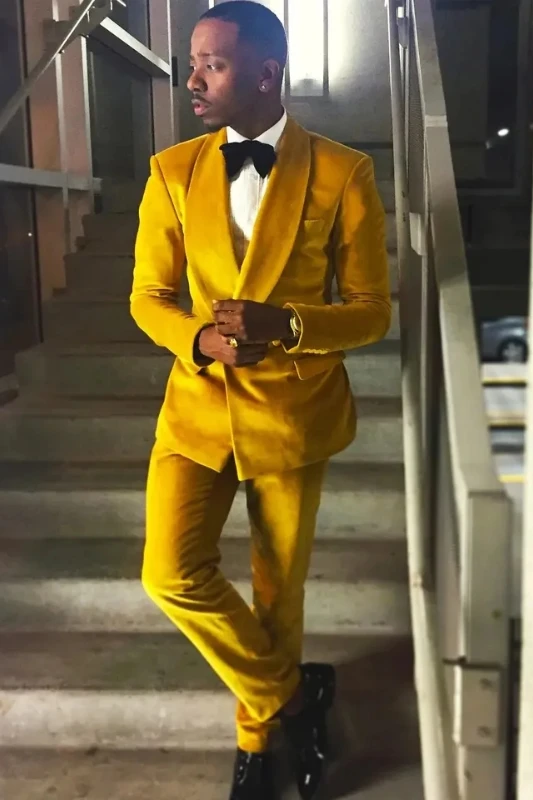Bruno Handsome Gold Shawl Lapel Double Breasted Prom Suits