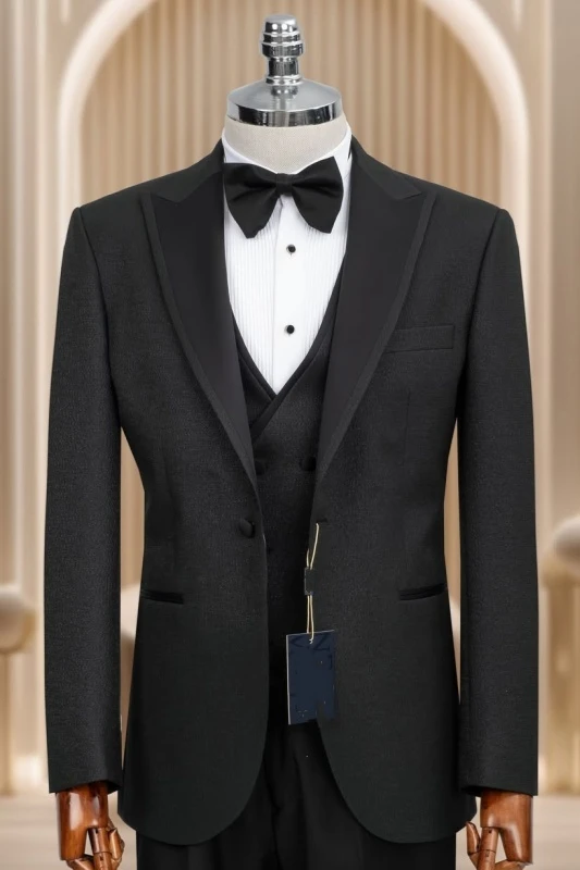 Carroll Newset Black Peaked Lapel Three Pieces Wedding Men Suits