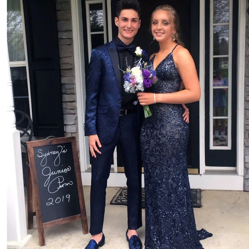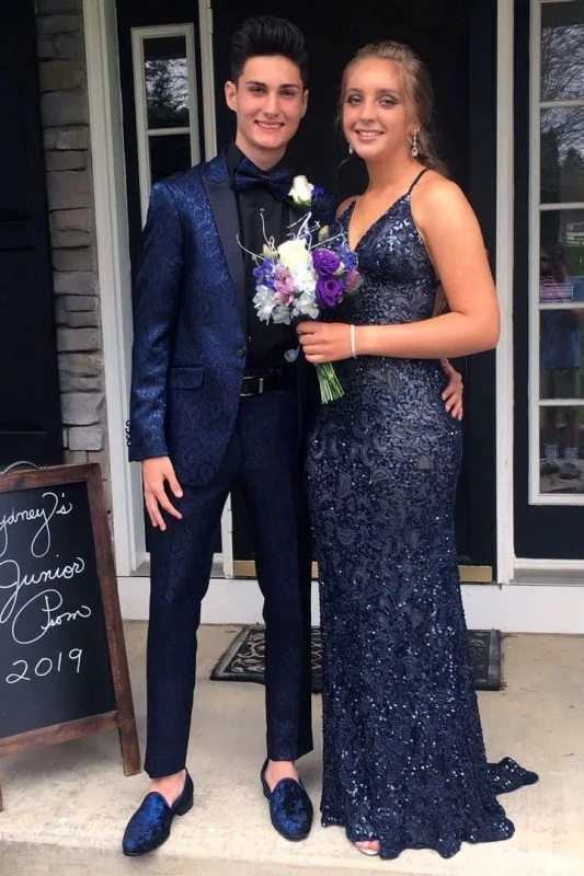 Charles Dark Blue Peaked Lapel Jacquard Prom Suits For Men