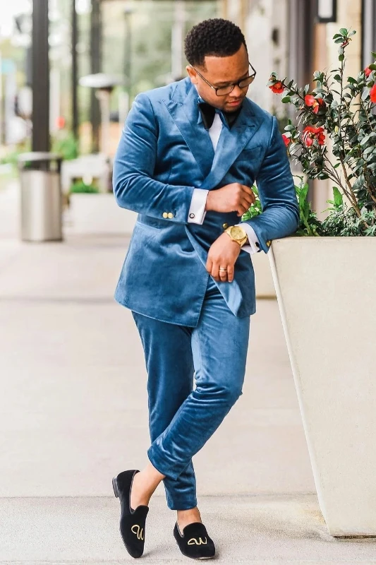 Cornell Special Navy Blue Peaked Lapel Double Breasted Velvet Prom Suits