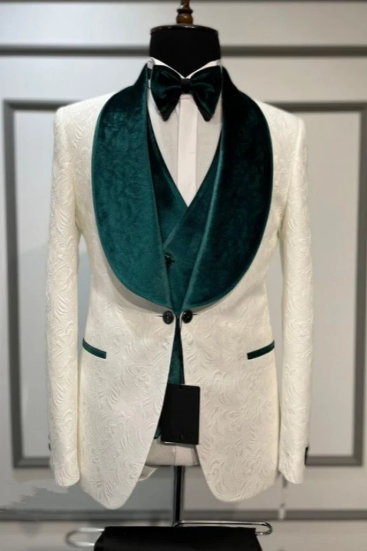 Ellis White Jacquard Three Pieces Wedding Men Suits With Green Velvet Shawl Lapel