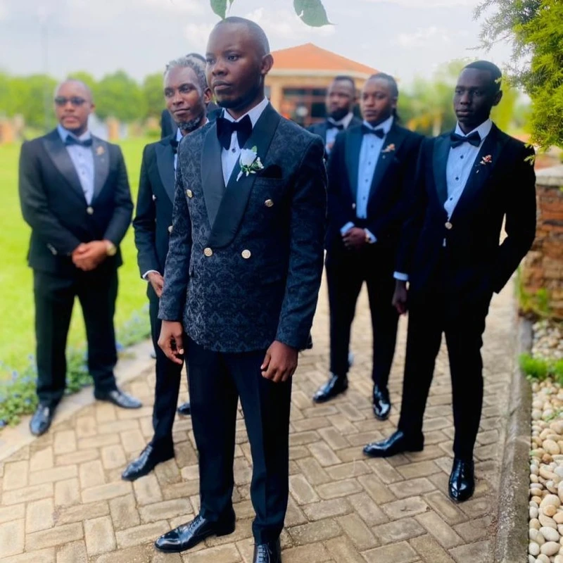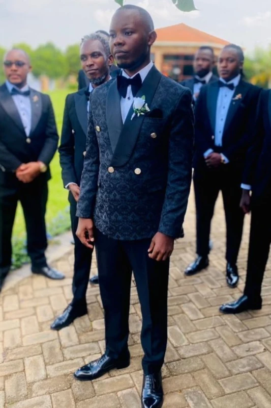 Elroy Trendy Black Jacquard Shawl Lapel Double Breasted Prom Men Suits