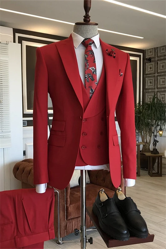 Eric Stylish Red Peaked Lapel Three Pieces Prom Suits