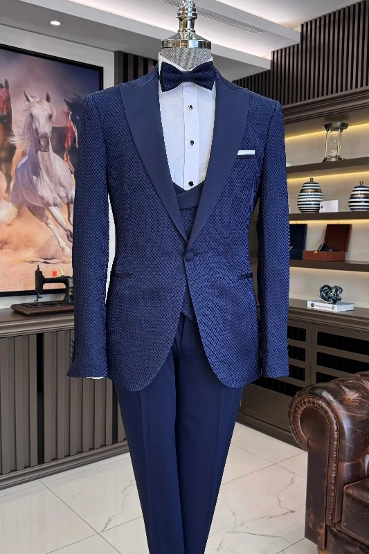 Everley Dark Blue Peaked Lapel Plaid Men Suits
