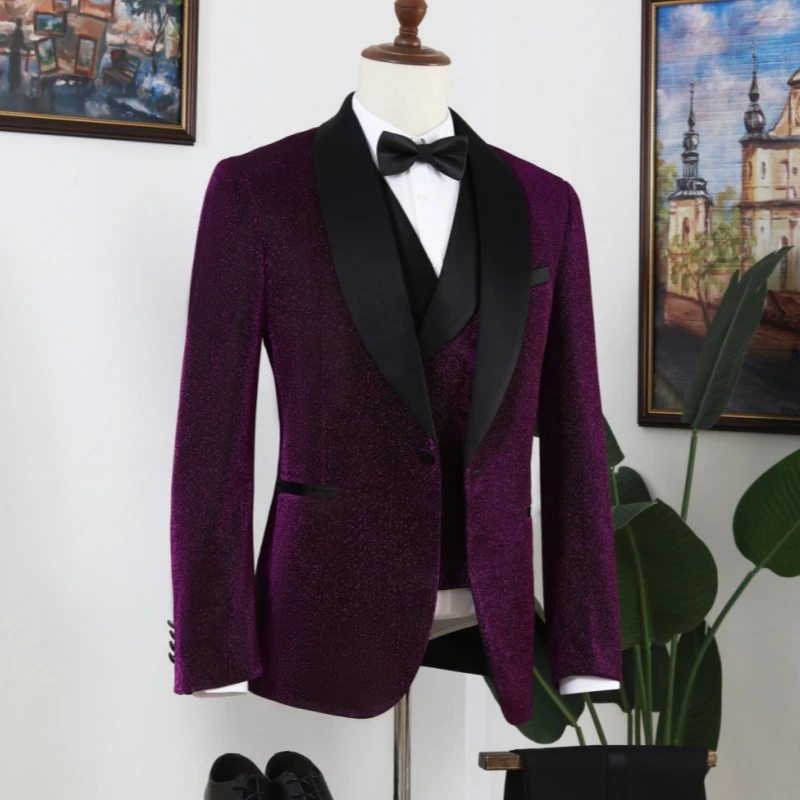 Fabian Grape Shawl Lapel Three Pieces Velvet Wedding Men Suits