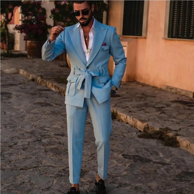 Florian Stylish Light Blue Peaked Lapel Slim Fit Prom Men Suits With Belt
