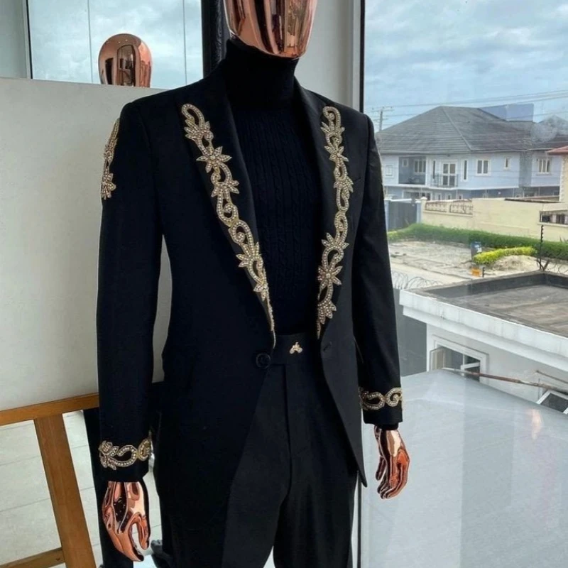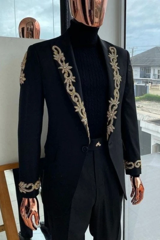 Ford New Arrival Black Peaked Lapel Appliques Men Suits