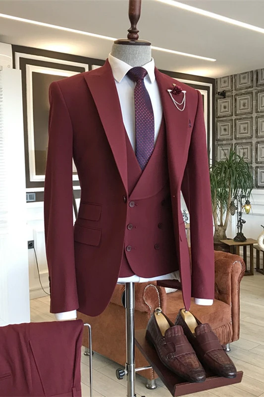 Ford Stylish Burgundy Peaked Lapel Three Pieces Prom Suits