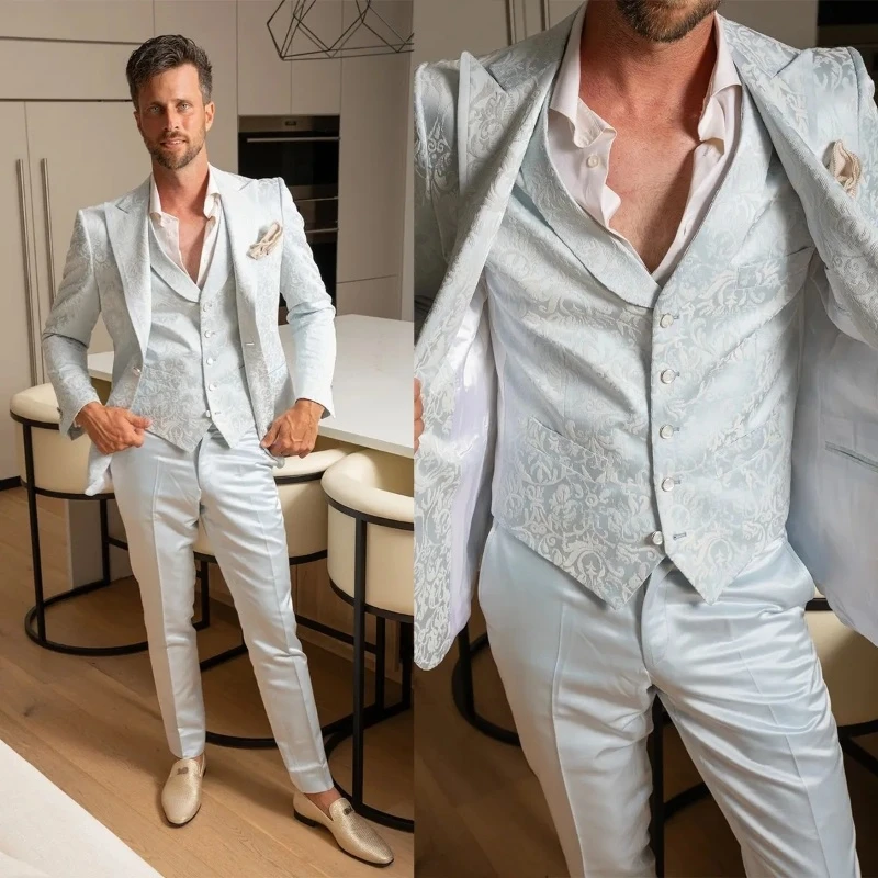 Gavin White Jacquard Peaked Lapel Three Pieces Men Suits For Wedding