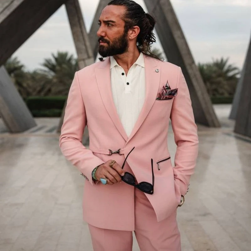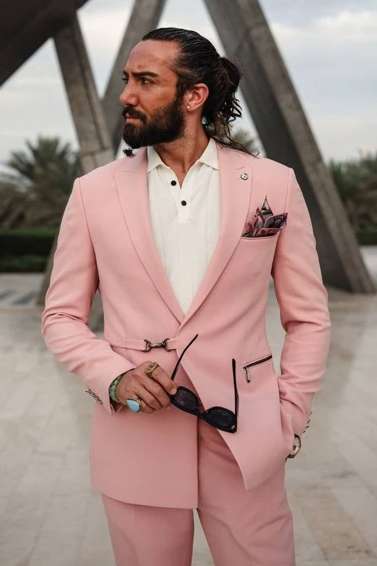 Gene Fashion Pink Peaked Lapel Prom Men Suits With Zipper Pockets