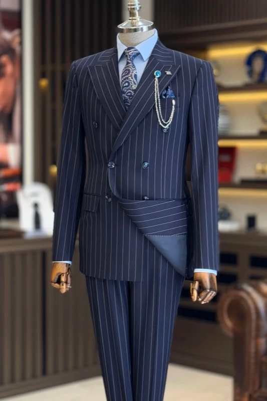 Hilary Dark Navy Peaked Lapel Double Breasted Striped Business Men Suits