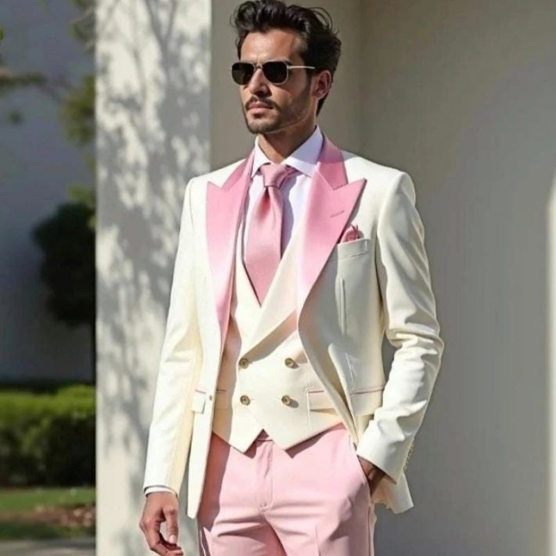 Isidore Fancy White Three Pieces Men Suits With Pink Satin Shawl Lapel