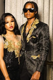 Isidore Fashion Black Peaked Lapel Jacquard Prom Men Suits With Gold Appliques