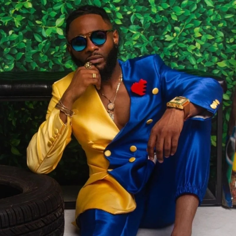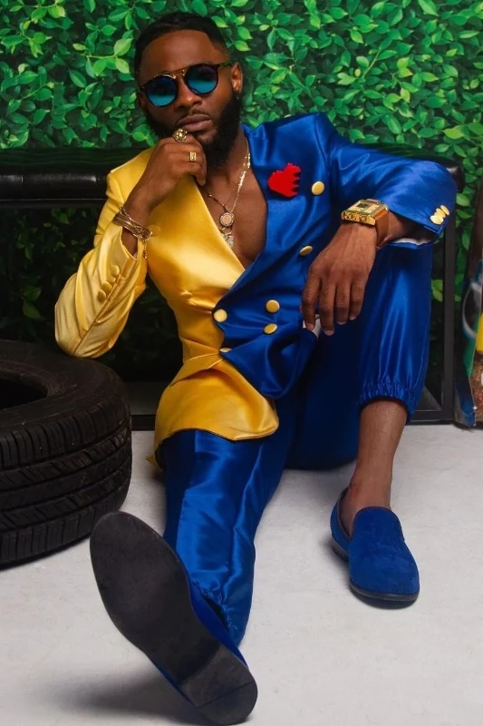 Keith Stylish Blue And Yellow Shawl Lapel Double Breasted Satin Men Suits For Prom