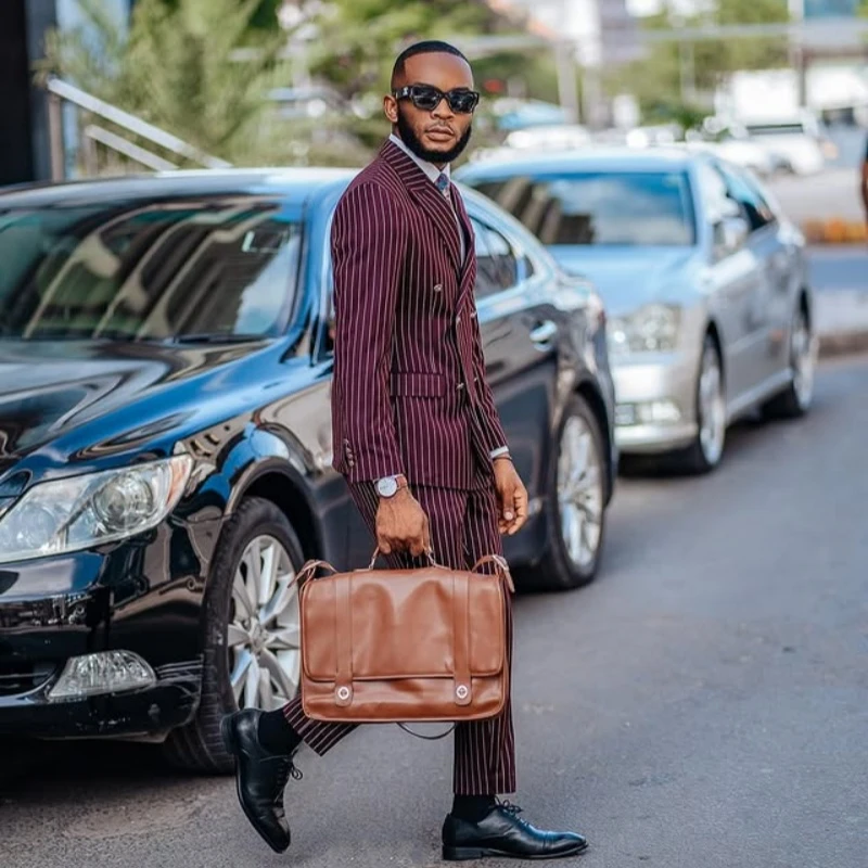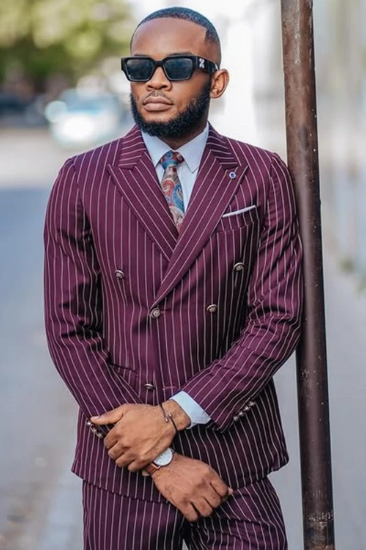 Kent Burgundy Peaked Lapel Double Breasted Striped Prom Men Suits