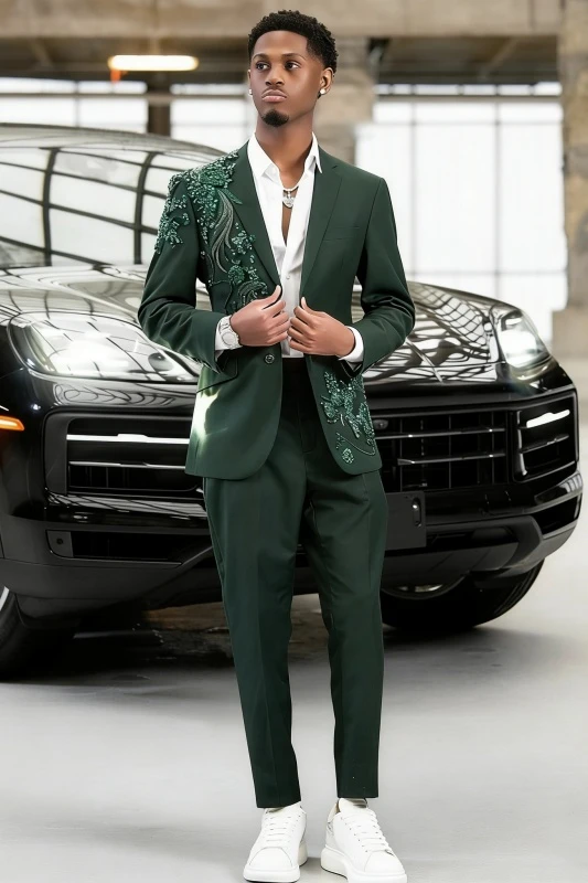 Kerr Newest Dark Green Notched Lapel Appliques Men Suits For Prom