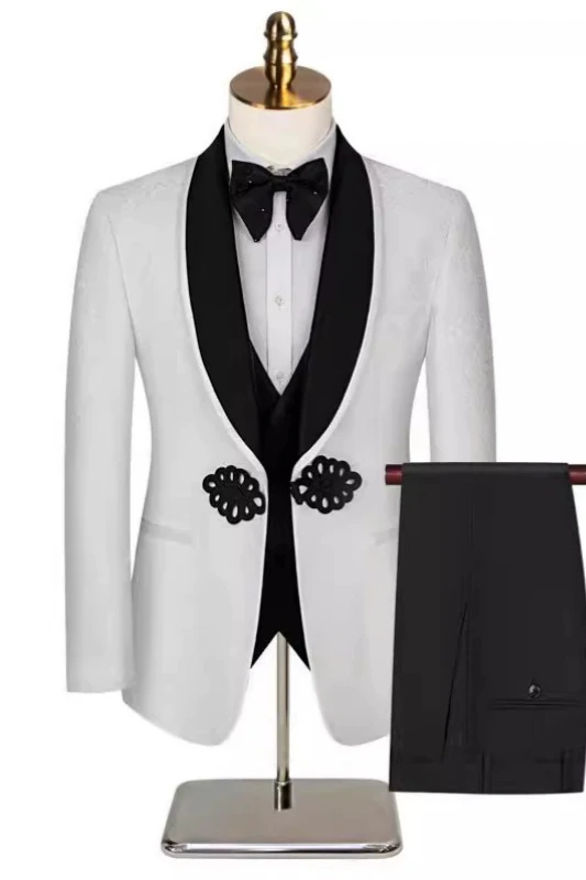 Klein Fancy White Jacquard Three Pieces Wedding Men Suits With Black Shawl Lapel