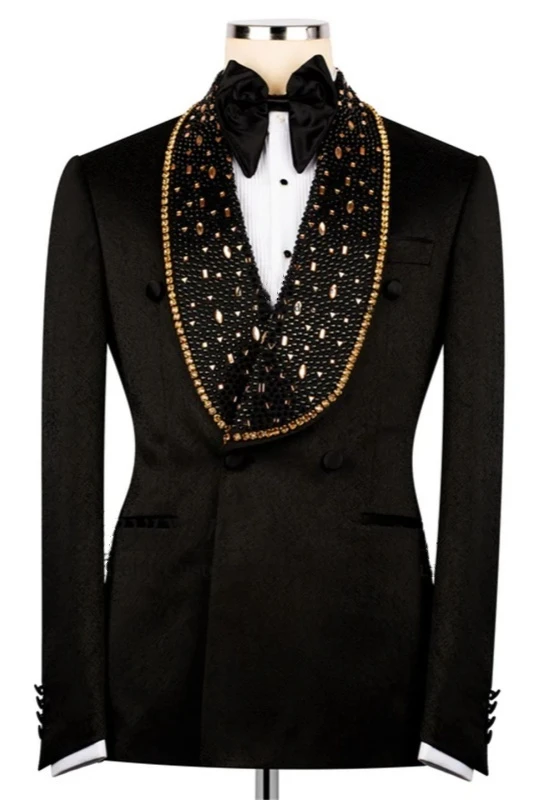 Knox Modern Black Shawl Lapel Double Breasted Wedding Men Suits With Beadings