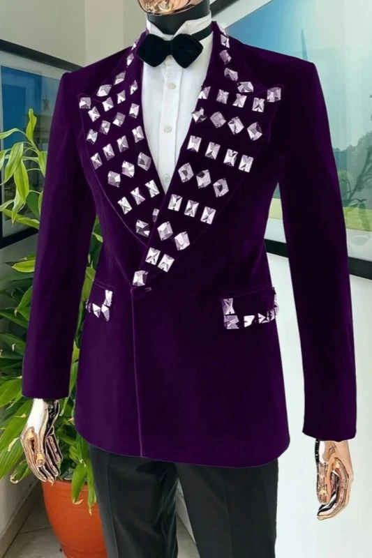 Lloyd Fashion Dark Purple Velvet Peaked Lapel Prom Men Suits With Rhinestones