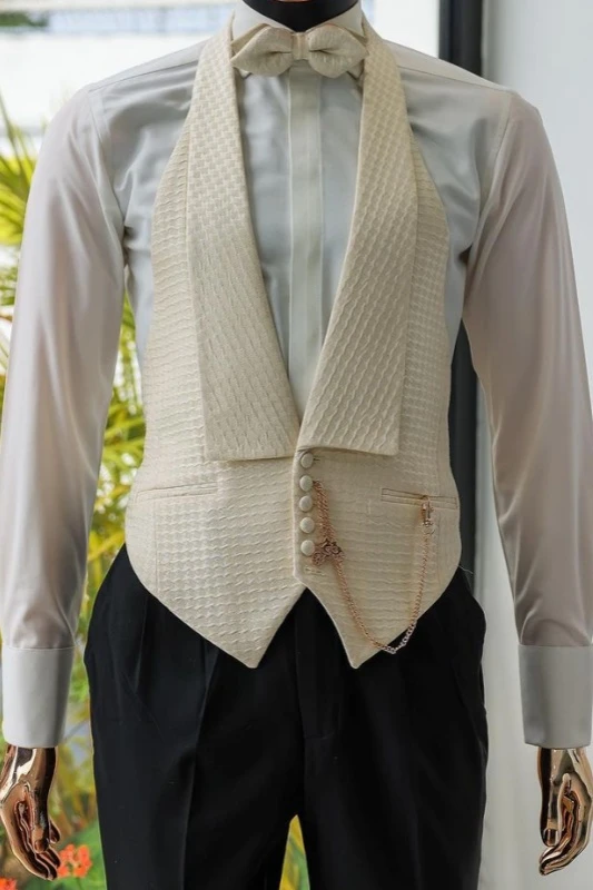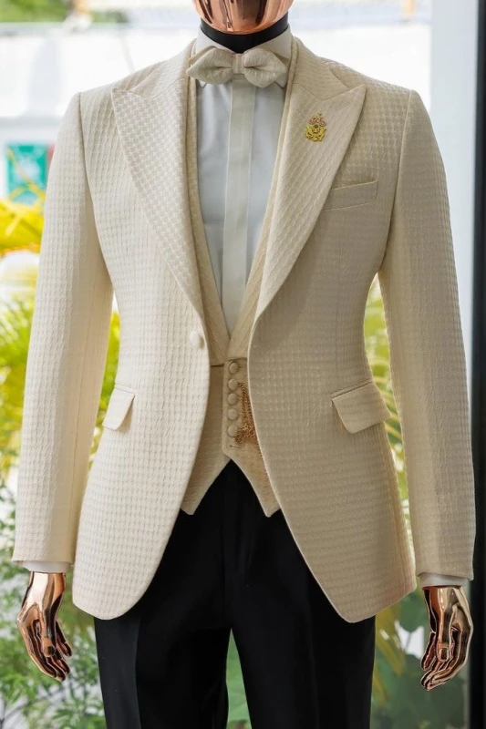 Mark Trendy Beige Peaked Lapel Plaid Three Pieces Wedding Men Suits