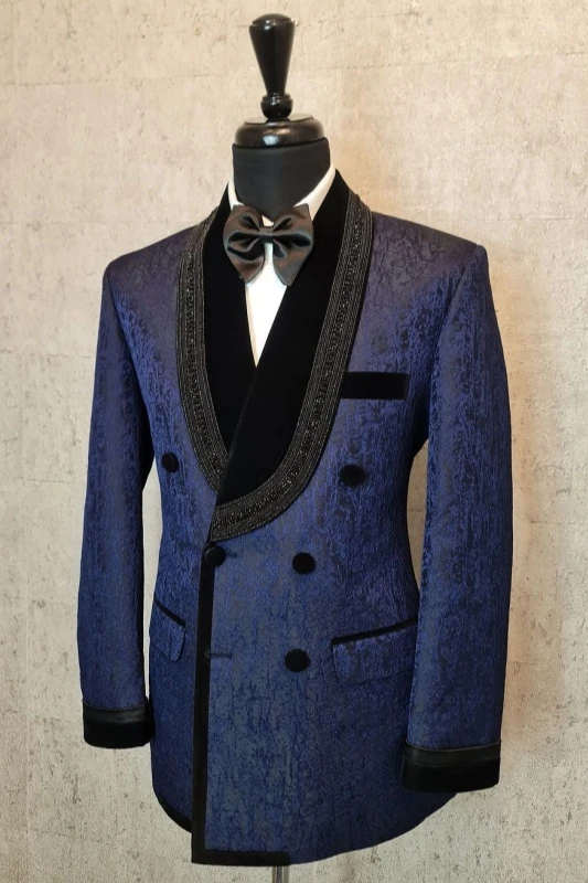 Mason Navy Blue Jacquard Shawl Lapel Double Breasted Wedding Men Suits