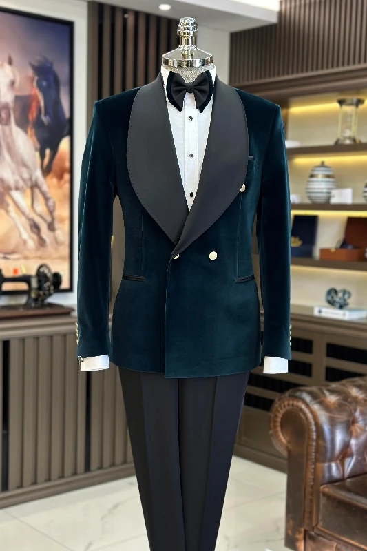 Matt Dark Green Shawl Lapel Double Breasted Velvet Men Suits