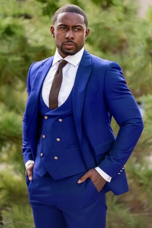 Nash Fashion Royal Blue Peaked Lapel Double Breasted Three Pieces Men Suits