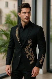 Nathan Modern Black Notched Lapel Appliques Prom Men Suits
