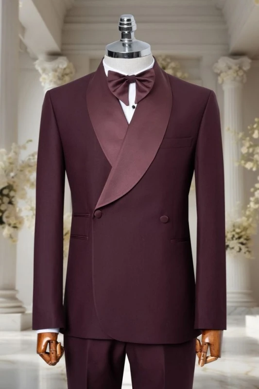 Newman Burgundy Shawl Lapel Double Breasted Wedding Men Suits