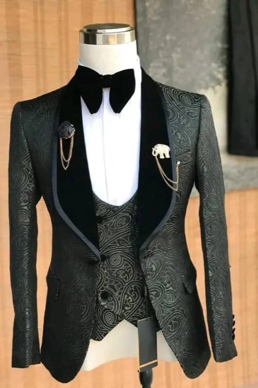 Pete Black Jacquard Three Pieces Wedding Men Suits With Velvet Shawl Lapel