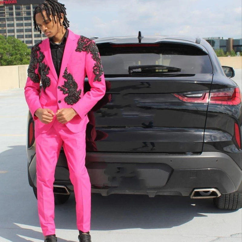 Peterson Newset Fuchsia Notched Lapel Close Fitting Men Suits With Black Appliques