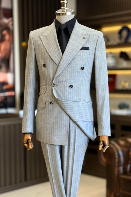 Porter Light Gray Peaked Lapel Double Breasted Striped Business Men Suits