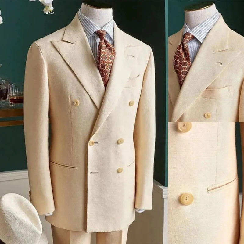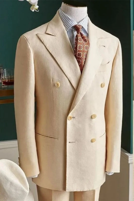 Ray Trendy Linen Apricot Peaked Lapel Double Breasted Prom Men Suits