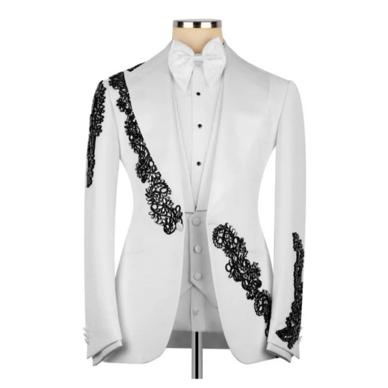 Reeves Fashion White Peaked Lapel Three Pieces Appliques Men Suits For Prom
