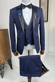 Ronald New Arrival Navy Blue Peaked Lapel Three Pieces Prom Suits For Men