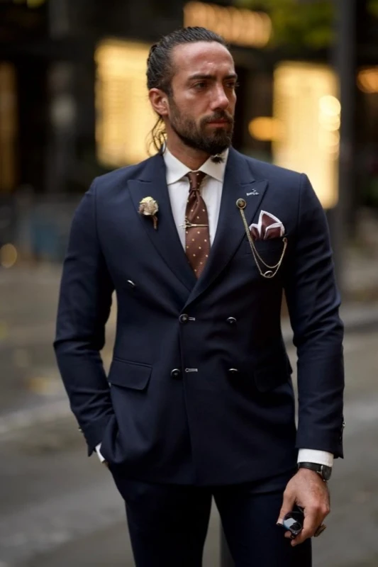 Sam Dark Blue Peaked Lapel Double Breasted Prom Men Suits